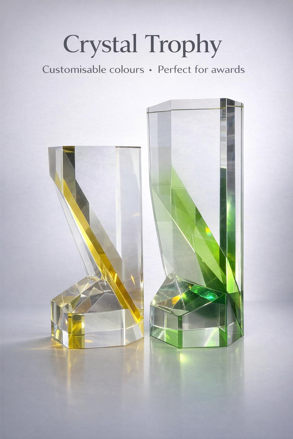 Crystal, acrylic, metal, and wood trophies. Custom engraving and design for corporate events, sports, and ceremonies.